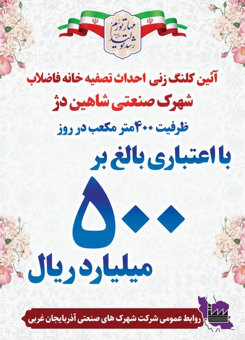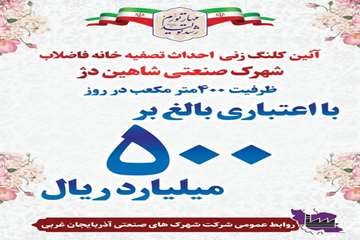 به گزارش روابط عمومی شرکت شهرک های صنعتی آذربایجان غربی ، همزمان با دهه فجر آیین کلنگ زنی احداث تصفیه خانه فاضلاب شهرک صنعتی شاهین دژ یا حضور جناب آقای ذوالفقاری معاون توسعه مدیریت استانداری برگزار گردید.