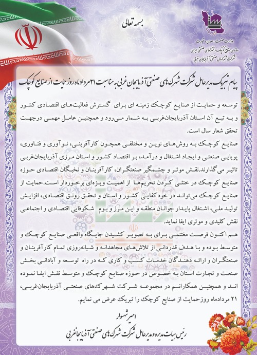 پیام تبریک مدیرعامل شرکت شهرک های صنعتی آذربایجان غربی به مناسبت 21مرداد ماه روز حمایت از صنایع کوچک